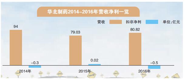 華北制藥近幾年業(yè)績情況一直不太樂觀,北京商報記者翻閱公司財報發(fā)現,2014-2015年,華北制藥營收均呈下降趨勢,較上年分別同比下降24.42%、15.87%,實現扣非凈利分別為-3054萬元、240萬元;2016年,公司營收有2.28%的增幅,扣非凈利為-5123萬元。