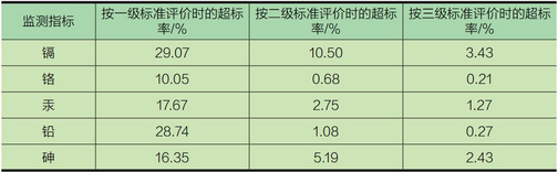 表1 土壤環(huán)境質(zhì)量主要重金屬監(jiān)測指標(biāo)超標(biāo)率統(tǒng)計表