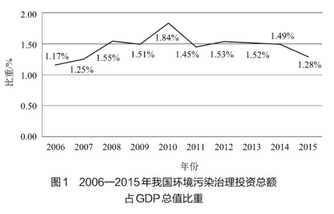 我國環(huán)保投資水平大大低于發(fā)達國家。發(fā)達國家的經(jīng)驗是:當一個國家的環(huán)保投資占GDP比例在1%~2%時,至多只能防止環(huán)境狀況的進一步惡化;而要使環(huán)境質(zhì)量發(fā)生明顯的好轉(zhuǎn),環(huán)保投資額要占到同期GDP的3%~5%。2011年英國環(huán)保投資占GDP比重為5.28%,法國為5.27%,意大利為3.14%,日本為6.17%。而我國環(huán)境污染治理投資額占GDP比重近十年來總體保持較低水平,基本為1.15%~1.85%,2010年之后甚至出現(xiàn)較明顯的下降,2015年環(huán)境污染治理投資占GDP比重降至1.28%,如圖1所示。