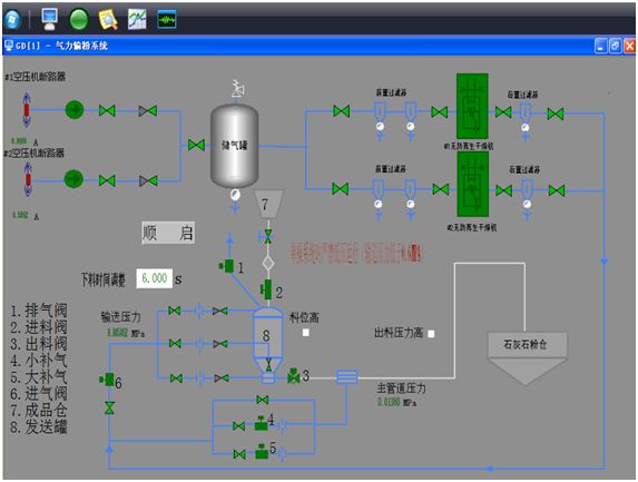 控制范圍:從發(fā)送罐進料口到#3石灰石粉倉庫頂入口為止的所有設(shè)備及儀表,主要控制范圍如下:進料閥、進氣閥、出料閥、排氣閥、大補氣閥、小補氣閥、料位計電接點壓力表、灰管壓力變送器、空氣母管壓力變送器、儀用氣母管壓力變送器。