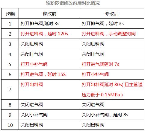 3、經(jīng)過對輸粉邏輯進行研究,發(fā)現(xiàn)不能“順啟”的主要原因是,輸粉邏輯中氣動門打開先后順序不合理,氣動門開、關(guān)時間和邏輯設(shè)置存在問題。出料閥經(jīng)常犯卡打不開,主要是原來的邏輯設(shè)置(“打開進氣閥,開到位延時15s”→“打開出料閥”),由于設(shè)置中“打開進氣閥”的時間較長,造成發(fā)送罐內(nèi)氣化時間較長,發(fā)送罐內(nèi)壓力過高,這樣發(fā)送罐出料閥頂著壓力開閥,因此經(jīng)常犯卡,開不動;在當時的運行調(diào)整中由于出料閥犯卡開不動,試想通過打開進料閥或排氣閥釋放發(fā)送罐內(nèi)的壓力,結(jié)果由于發(fā)送罐內(nèi)壓力過高,導(dǎo)致進料閥和排氣閥也經(jīng)常犯卡,打不開,嚴重時就找檢修人員處理。