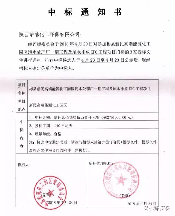2018年4月24日,陜西華陸化工環(huán)保有限公司成功中標(biāo)彬縣新民高端能源化工園區(qū)污水處理廠(chǎng)一期工程及尾水排放EPC工程項(xiàng)目(以下簡(jiǎn)稱(chēng):中標(biāo)項(xiàng)目),中標(biāo)金額為6275.1萬(wàn)元。