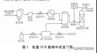 本低溫SCR脫硝中試的工藝流程如圖1所示,采用尾部布設(shè)低溫SCR工藝。流量計1控制進入脫硝中試裝置的煙氣量,煙氣經(jīng)除濕器后由電加熱器加熱。氨氣來源于液氨鋼瓶,由流量計2控制進入系統(tǒng)的氨氣量,以滿足中試設(shè)定的氨氮摩爾比。流量計3控制進入氨氣稀釋器的空氣量,稀釋后的氨氣在混合器中與煙氣充分混合后進入脫硝反應(yīng)器。低溫SCR催化劑裝填于脫硝反應(yīng)器中,反應(yīng)器內(nèi)徑0.3m,催化劑裝填高度約0.24m,催化劑層設(shè)有溫度探頭。中試采用德國SICK公司生產(chǎn)的S710多組分氣體分析儀對脫硝反應(yīng)器進出口的煙氣組分進行連續(xù)在線監(jiān)測。