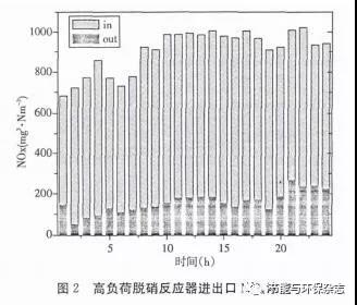 進入脫硝中試裝置的煙氣流量約為55m3/h,通過現(xiàn)場調(diào)試,選定催化劑層溫度為150℃進行脫硝中試。結(jié)合焦?fàn)t高負(fù)荷運行時的尾氣氮氧化物濃度,設(shè)定進入系統(tǒng)的氨氣流量為0.35L/min。中試裝置開啟2h后,催化劑層溫度上升并維持在150℃。由分析儀所得數(shù)據(jù)可計算出NOx去除率,即脫硝效率。圖2為反應(yīng)器進出口的NOx濃度,淺色柱的峰值對應(yīng)的是反應(yīng)器入口的NOx濃度,深色柱的高度為反應(yīng)器出口的NOx濃度。圖3為與圖2相對應(yīng)的高負(fù)荷運行脫硝效率圖。