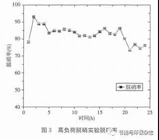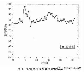 中試期間,由于焦化廠部分工段檢修,焦?fàn)t進入低負(fù)荷運行狀態(tài),尾氣中NOx濃度均值約500mg/Nm3,故對低負(fù)荷的煉焦尾氣進行連續(xù)脫硝中試。中試條件:進入脫硝中試裝置的煙氣流量55m3/h左右,催化劑層溫度150℃,進入系統(tǒng)的氨氣的流量0.2L/min。圖4為低負(fù)荷連續(xù)脫硝實驗脫硝率圖,圖示連續(xù)脫硝實驗運行時間為52小時。脫硝率在78%~98%范圍內(nèi),運行期間催化劑活性未出現(xiàn)減弱趨勢,實驗結(jié)果顯示選用的低溫催化劑可用于焦化煙氣的連續(xù)脫硝,并維持高的脫硝率。