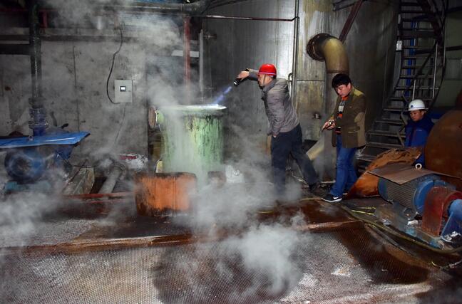 2017年2月19日晚,環(huán)境保護部2017年第一季度空氣質(zhì)量專項督查第13督查組督查人員在企業(yè)生產(chǎn)車間檢查。攝影/章軻