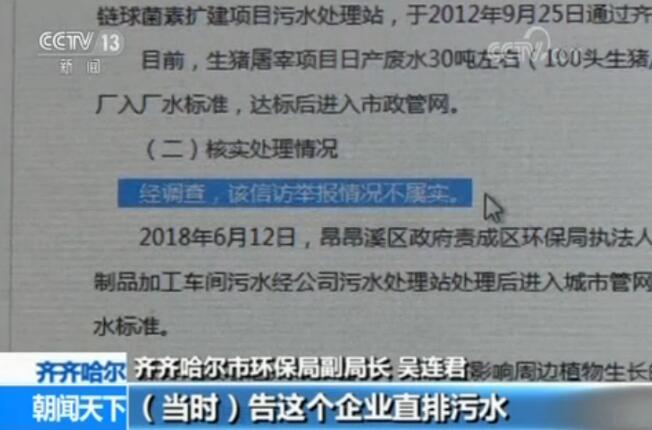 齊齊哈爾市環(huán)保局副局長吳連君:當時告“這個企業(yè)直排污水,水呈黑色且有異味,影響周邊植物生長”,他?回答的是:認為企業(yè)有污水治理設施,處理完了進入城市管網(wǎng)排放,就根據(jù)這個,來定的是群眾舉報不屬實。