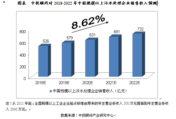 2016年,我國(guó)規(guī)模以上污水處理企業(yè)銷(xiāo)售收入達(dá)到了442.78億元,相比上年增長(zhǎng)4.52%。我們預(yù)計(jì),2018年我國(guó)規(guī)模以上污水處理企業(yè)銷(xiāo)售收入將達(dá)到526億元,未來(lái)五年(2018-2022)年均復(fù)合增長(zhǎng)率約為8.62%,2022年將達(dá)到732億元。