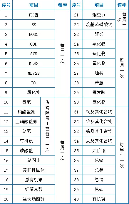 水質監(jiān)控指標按《城鎮(zhèn)污水處理廠污染物排放標準》GB18918-2002和建廠時批準的環(huán)境影響評價報告確定的級別執(zhí)行,各檢測項目的檢測周期參照《城市污水處理廠運行、維護及其安全技術規(guī)程》CJJ60-94執(zhí)行。即PH值、SS、BOD5、CODcr、NH3-N、TN、TP每日一次,糞大腸菌群數(shù)每周一次,其余檢測指標每半年檢測一次。一般排水公司為確保污水處理廠能夠達到環(huán)保局要求,會適當提高對污水處理廠的監(jiān)控標準。
