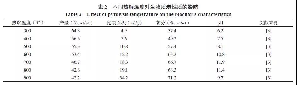 一般來(lái)說(shuō)在熱解過(guò)程中隨著溫度的升高,生物質(zhì)炭的產(chǎn)量會(huì)逐漸降低、生物質(zhì)炭的比表面積和孔隙結(jié)構(gòu)會(huì)變得更加豐富。已有研究表明,污泥生物質(zhì)炭的產(chǎn)量由300 ℃時(shí)的64.3%(wt/wt)下降到900 ℃時(shí)的 42.2%(wt/wt);而比表面積由300 ℃時(shí)的4.9 m2/g 增加到900 ℃時(shí)的34.2 m2/g (表2)。生物質(zhì)炭表面的-COOH、-COH 和-OH 等含氧官能團(tuán)逐漸增多,由此產(chǎn)生的表面負(fù)電荷使得生物質(zhì)炭具有較高的陽(yáng)離子交換量(CEC)。熱解溫度越高,生物質(zhì)炭的pH 越高,這是由于熱解過(guò)程中會(huì)產(chǎn)生大量灰分,其中的礦質(zhì)元素溶于水后呈堿性所致。