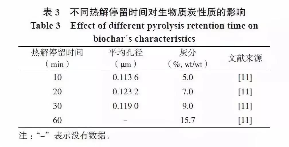 生物質(zhì)炭具有復(fù)雜的孔隙結(jié)構(gòu),其孔徑大小決定其比表面積。而生物質(zhì)炭的孔徑大小與熱解停留時(shí)間也有關(guān)系。當(dāng)熱解停留時(shí)間為20~30 min 時(shí),生物質(zhì)炭的平均孔徑相對(duì)于停留時(shí)間10 min 時(shí)的孔徑尺寸提高了4.8%~8.5%(表3)。灰分含量也會(huì)隨著熱解停留時(shí)間的延長(zhǎng)而增加。Tan 等分析結(jié)果表明熱解停留時(shí)間為20 min,生物質(zhì)炭的灰分含量為7.0% ;停留時(shí)間為60 min,其灰分含量增加至15.7%。這是由于熱解停留時(shí)間長(zhǎng),易于有機(jī)物質(zhì)揮發(fā)而殘留更多的灰分。