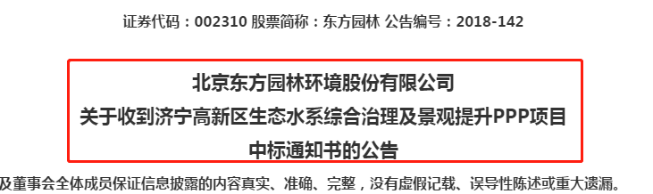 9月7日晚間,東方園林公告稱,公司為濟(jì)寧高新區(qū)生態(tài)水系綜合治理及景觀提升PPP項目的中標(biāo)聯(lián)合體,項目總投資20.21億元。