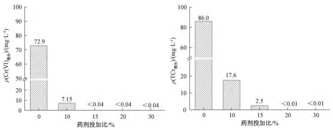 小試試驗設(shè)計取場地污染土壤,測得Cr(Ⅵ) 濃度為3156.7mg/kg,Cr(Ⅵ) 浸出濃度為72.9mg/L,總鉻浸出濃度為86.0mg /L, pH=10.2。自然風(fēng)干后過 5 mm 不銹鋼篩,測定篩下產(chǎn)品含水率,干燥保存待用。取100g上述污染土壤置于聚丙烯罐中,分別按土壤質(zhì)量的0%、10%、15%、20%、30%添加 29%的多硫化鈣水劑,補充蒸餾水,使土壤含水率為其飽和含水率的90% 。攪拌均勻,密封反應(yīng),在反應(yīng)的第7天取樣送檢,分別測定Cr(Ⅵ) 濃度、Cr(Ⅵ) 浸出濃度和總鉻浸出濃度。