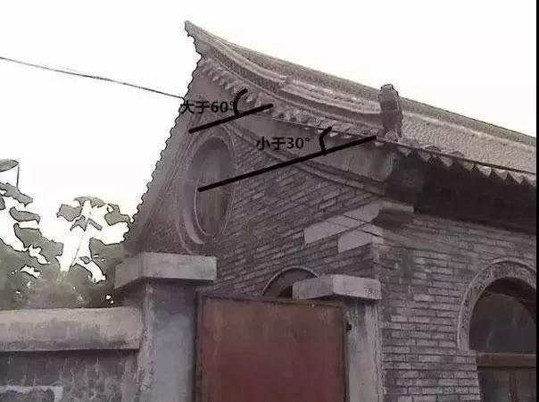 中國傳統(tǒng)建筑的屋頂,多用大坡度的設(shè)計,靠近屋脊的坡度超過60°,而靠近房檐的坡度小于30°,利用慣性使快速流下的雨水沖出屋檐外。