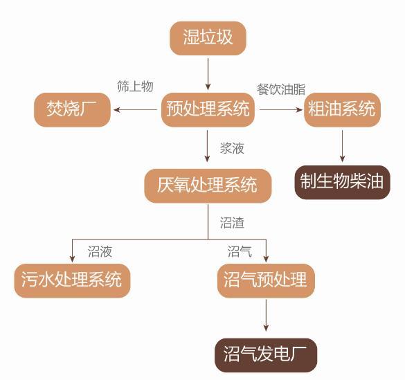 厭氧發(fā)酵處理工藝是利用厭氧微生物將濕垃圾轉換成沼氣、沼液、沼渣,沼氣可以燃燒供熱或發(fā)電,實現(xiàn)資源利用。沼液經過水處理系統(tǒng)處理達標后排放,惡臭氣體經負壓收集后凈化排放。