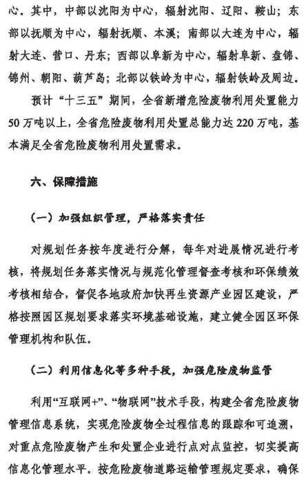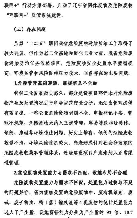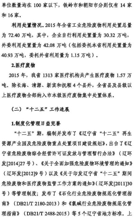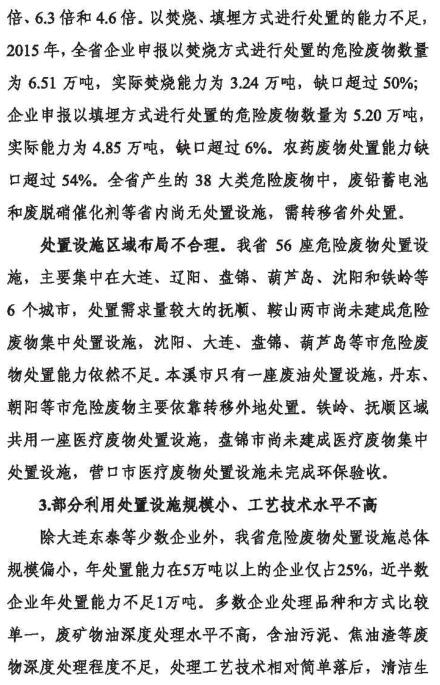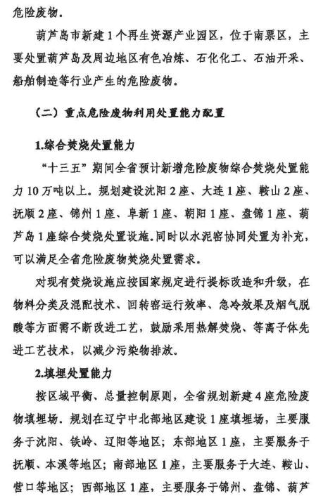 日前,遼寧環(huán)保廳公布了《遼寧省“十三五”危險廢物污染防治規(guī)劃》,預(yù)計“十三五”期間危險廢物利用處置設(shè)施建設(shè)資金投入達20億元以上,全省新增危險廢物處置能力50萬噸以上,全省危險廢物利用處置總能力達220萬噸,基本滿足全省危險廢物利用處置需求。