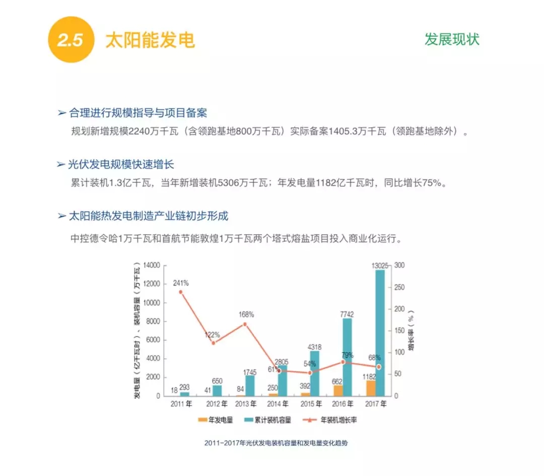 在太陽能發(fā)電方面,去年我國(guó)新增裝機(jī)5306萬千瓦,目前我國(guó)光伏發(fā)電累計(jì)裝機(jī)已達(dá)1.3億千瓦。同時(shí),我國(guó)太陽能熱發(fā)電制造產(chǎn)業(yè)鏈也初步形成。2017年太陽光伏發(fā)電投資規(guī)模快速增長(zhǎng),比2016年增長(zhǎng)了41%,同時(shí)單位千瓦造價(jià)部分已經(jīng)降低至每千瓦5500元以下,棄光的現(xiàn)象也得到了有效控制。