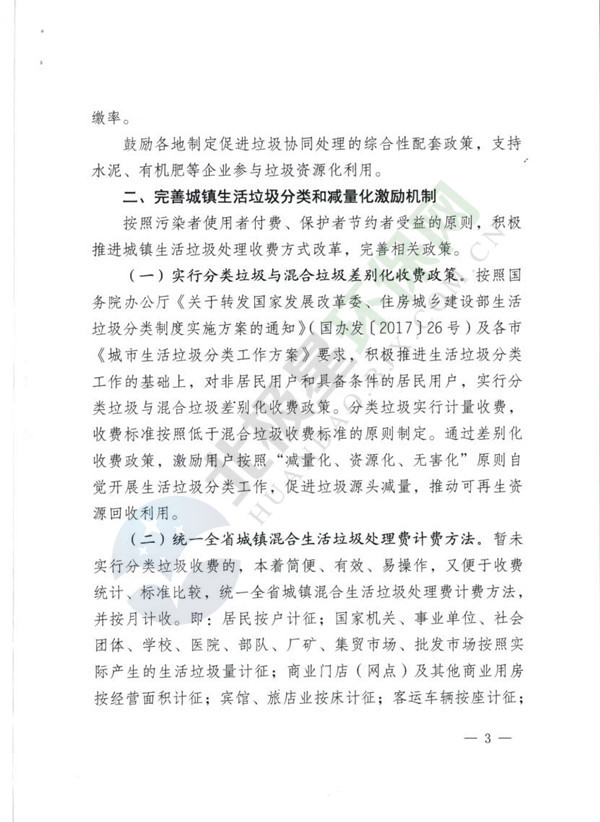 在積極推進生活垃圾分類工作的基礎上,對非居民用戶和具備條件的居民用戶,實行分類垃圾與混合垃圾差別化收費政策。分類垃圾實行計量收費,收費標準按照低于混合垃圾收費標準的原則制定。通過差別化收費政策,激勵用戶按照“減量化、資源化、無害化”原則自覺開展生活垃圾分類工作,促進垃圾源頭減量,推動可再生資源回收利用。暫未實行分類垃圾收費的,統(tǒng)一全省城鎮(zhèn)混合生活垃圾處理費計費方法,并按月征收。即:居民按戶計征;國家機關、事業(yè)單位、社會團體、學校、醫(yī)院、部隊、廠礦、集貿(mào)市場、批發(fā)市場按照實際產(chǎn)生的生活垃圾量計征;商業(yè)門店(網(wǎng)點)及其他商業(yè)用房按經(jīng)營面積計征;賓館、旅店業(yè)按床計征;客運車輛按座計征;餐廚垃圾按照實際產(chǎn)生量計征;其他產(chǎn)生生活垃圾的單位和個人按照定額或計量的方式計征。