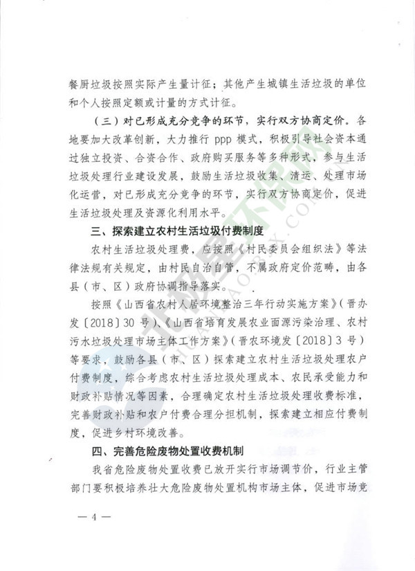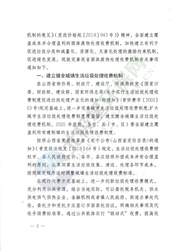 日前山西省發(fā)展和改革委員會、山西省財政廳、山西省住房和城鄉(xiāng)建設廳、山西省生態(tài)環(huán)境廳、山西省衛(wèi)生健康委員會聯(lián)合下發(fā)《關于完善固體廢物處理收費機制的通知》,明確提出按照污染者使用者付費、保護者節(jié)約者受益的原則,積極推進城鎮(zhèn)生活垃圾處理收費方式改革。