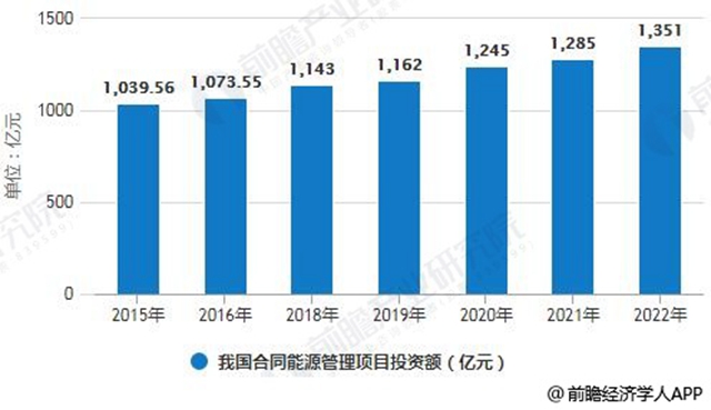 2015年,我國合同能源管理項目投資額為1039.56億元,同比增長8.43%。到了2016年我國合同能源管理項目投資額為1073.55億元,同比增長3.27%。綜合以上因素,預計2018年我國合同能源管理項目投資額將達到1143億元,未來五年(2018-2022)年均復合增長率約為4.26%,預測到了2022年我國合同能源管理項目投資額將達到1351億元。