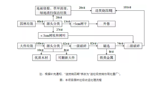 (2)綠化垃圾:針對綠化作業(yè)、臺風天氣產(chǎn)生的樹枝、樹干、樹根進行破碎,破碎后可以直接轉(zhuǎn)運至垃圾焚燒發(fā)電廠焚燒發(fā)電,也可制成生物質(zhì)燃料。
