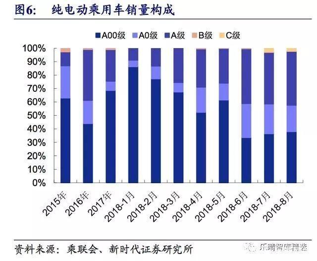 2018 年補(bǔ)貼新政出臺,更加鼓勵長續(xù)航里程乘用車,受過渡期后補(bǔ)貼大幅減少甚至取消的影響,短續(xù)航里程 A00級車型在 6 月 12 日前出現(xiàn)搶裝行情,過渡期結(jié)束后銷量占比逐步減少。
