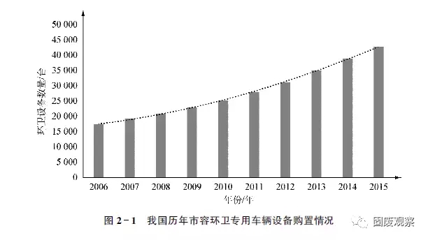 據(jù)國家統(tǒng)計局統(tǒng)計,截至2015年年底,我國城鎮(zhèn)化率已經(jīng)達到56.1%。且目前正以年均1個百分點的速度增長。2015年,全國市容環(huán)衛(wèi)專用車輛設備共42702臺,同比增加3789臺,如圖2-1所示。