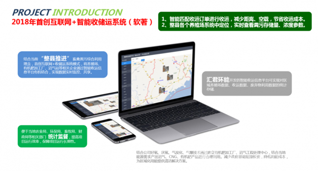 國(guó)家從2008年開(kāi)始開(kāi)始關(guān)注畜禽處理,2017年已經(jīng)開(kāi)始形成規(guī)?;?。而匯君環(huán)能同時(shí)也從去年開(kāi)始著手規(guī)劃整縣(市)資源化的處理,利用匯君模式,根據(jù)當(dāng)?shù)氐膶?shí)際情況,合理規(guī)劃沼氣工程中心站,另外以村鎮(zhèn)為單位、以公里半徑為單位、以養(yǎng)殖規(guī)模為單位,建立有機(jī)肥加工廠,采用智能化收儲(chǔ)運(yùn)平臺(tái),有效利用地方的政策,配合消納政策,實(shí)現(xiàn)全方位畜禽糞污資源化智能處理。