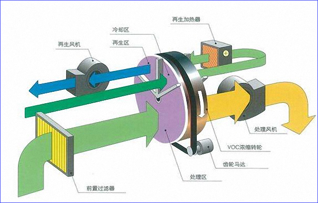 RTO系統(tǒng)的核心組成部分——沸石輪轉(zhuǎn)濃縮機(jī)(RC),可以分為處理區(qū)、再生區(qū)、冷卻區(qū)。含有VOC的被處理空氣通過(guò)過(guò)濾器后,送到濃縮轉(zhuǎn)輪的處理區(qū),VOC被吸附除去;吸附于濃縮轉(zhuǎn)輪的凈化后的空氣在再生區(qū)經(jīng)熱風(fēng)處理被脫附濃縮;濃縮轉(zhuǎn)卻在冷卻區(qū)被冷卻,經(jīng)過(guò)冷卻后的空氣,再經(jīng)加熱后作為再生空氣使用。