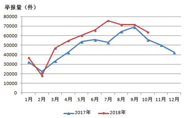 2018年10月,全國(guó)環(huán)保舉報(bào)管理平臺(tái)共接到環(huán)保舉報(bào)63883件,已受理54305件。其中,“12369”環(huán)保舉報(bào)熱線電話共31354件,微信舉報(bào)25831件,網(wǎng)上舉報(bào)6698件。從污染類(lèi)型來(lái)看,10月大氣污染、噪聲污染舉報(bào)較多。 一、秋冬季舉報(bào)出現(xiàn)下降趨勢(shì) 2018年10月...