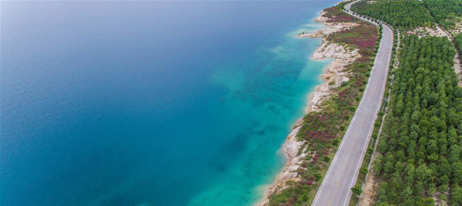 在位于廣東茂名市區(qū)西北角的露天礦,60多歲的退休市民陳阿姨站在一座歐式小木屋下乘涼。眼前是一片寬闊清澈的湖水,湖的兩岸樹木蔥蘢、綠草茵茵。而在四年前,這里還是一個被廢棄的油頁巖大礦坑,垃圾遍地、污水橫流,被當(dāng)?shù)厝送葱牡胤Q為這座城市的“傷疤”。這是茂名露天礦生態(tài)公園中的湖邊公路(8月17日攝)。上圖:...