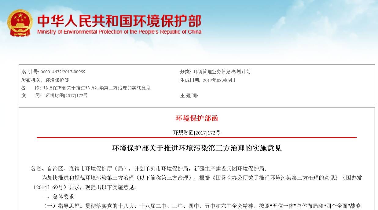 文章導(dǎo)讀 為加快推進(jìn)和規(guī)范環(huán)境污染第三方治理,環(huán)保部發(fā)布《環(huán)境保護(hù)部關(guān)于推進(jìn)環(huán)境污染第三方治理的實(shí)施意見(jiàn)》。文件中,細(xì)化環(huán)境污染第三方治理。劃定第三方責(zé)任,指出第三方治理單位應(yīng)建立臺(tái)賬記錄,將構(gòu)建第三方治理信息平臺(tái)。企業(yè)污染排放超標(biāo)超總量的,將實(shí)施第三方限期治理。并提出引入第三方支付機(jī)制,依環(huán)境績(jī)效...